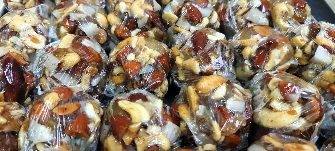 सबसे पहले, एक ब्लेंडर में 1 कप बीज रहित खजूर लें और 4-5 बार सूखा ही ब्लेंड करें। खजूर दरदरे पीस लें। फिर एक तरफ रख दें। साथ ही, काजू, पिस्ता और बादाम को भी बारीक काट लें। इन्हे पाउडर ना कर दें क्योंकि फिर आपको कुरकुरापन नहीं मिलेगा। एक कढाई लें और उसमें एक टीस्पून घी डालें। इसके अलावा, इसमें सभी सूखे मेवे जैसे कि किशमिश, काजू, पिस्ता और बादाम डालें। उन्हें मध्यम आंच पर 3-4 मिनट तक भूनें जब तक कि वे हल्के से रंग न बदल दें। अब इसमें ब्लेंड किये हुए डेट्स डालें। मध्यम आंच पर चलाते रहें और डेट्स को कलछी से अलग करते रहें। इससे डेट्स बाकी ड्राई फ्रूट्स में अच्छे से मिल जाते हैं। अब इलायची पाउडर डालें और भूनें। इन्हें तबतक भूनें, जबतक खजूर तेल छोड़ने लगे। अब आंच बंद कर दें और एक या दो मिनट के लिए ठंडा होने दें। फिर तुरंत लड्डू बनाना शुरू करें। यदि आप इसे पूरी तरह से ठंडा होने देते हैं, तो आप लड्डू नहीं बना पाएंगे। तुरंत परोसें या एयरटाइट कंटेनर में लड्डू को स्टोर करें।