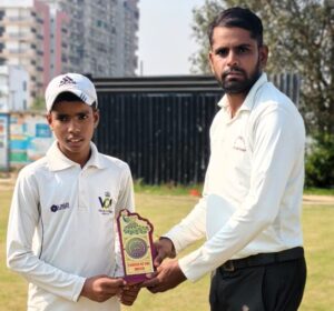 गाजियाबाद। जीएमएस क्रिकेट ग्राउंड, गाजियाबाद में स्ट्रैट ड्राईव स्पोर्ट्स द्वारा आयोजित प्रथम राम जी लाल मैमोरियल अंडर-14 क्रिकेट टूर्नामेंट 2025 का मैच जी.एम.एस.क्रिकेट एकेडमी और वीनस क्रिकेट एकेडमी के बीच खेला गया। जी.एम.एस क्रिकेट क्लब ने टॉस जीतकर गेंदबाजी का फैसला किया। वीनस एकेडमी की टीम को 31.3 ओवर में 140/10 रन पर समेट गयी। जिसमें अंश 42 रन , अनमोल 29 और अलंकृत ने 15 रन बनाए। जी.एम.एस की तरफ से गेंदबाजी करते हुए निर्वाण ने 5 ,नीतीश 3,माध्वीक एवं जतिन ने 1-1 विकेट लिए, जी.एम.एस क्रिकेट एकेडमी की टीम ने (21.2)ओवर में 144/1 रन बना कर मैच अपने नाम किया। जिसमें रमन ने 58* नाबाद,निहान 54*, और आदित्य ने 4 रनों का योगदान दिया। वीनस एकेडमी की और से गेंदबाजी करते हुए लवीश ने 1 विकेट लिया। टीम के एकजुट प्रदर्शन से जी.एम.एस क्रिकेट एकेडमी ने 9 विकेट से मैच अपने नाम किया। निर्वाण भारद्वाज को मैन ऑफ द मैच और हरफनमौला प्रदर्शन के लिए अंश शर्मा को फाइटर ऑफ द मैच का पुरष्कार दिया गया। मैच के दौरान दुष्यंत सिंह वालिया, युवराज ठाकुर ,सिकन्दर कुरैशी, सहित अन्य गणमान्य अतिथि मौजूद रहे।